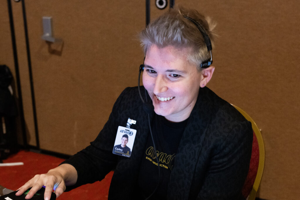 In live events, “comm” (short for communications) is the shorthand term used for the headset systems that production crews wear to talk to each other during your event. You might hear a stage manager say, “Is everyone on comm?” or a camera op ask, “Can I be on comms with the TD?”